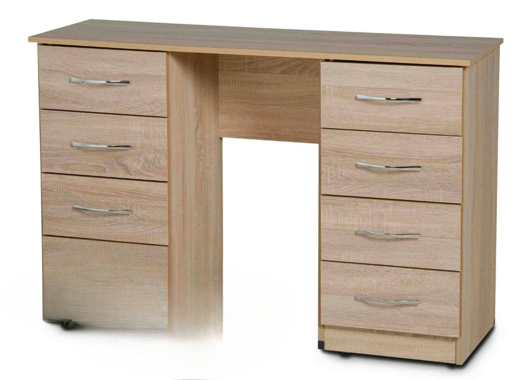 This stylish double-pedestal table offers a perfect blend of storage, functionality, and modern wood-grain design. Featuring eight spacious drawers—four on each side—it provides ample room for organizing cosmetics, stationery, accessories, documents, or other daily essentials.