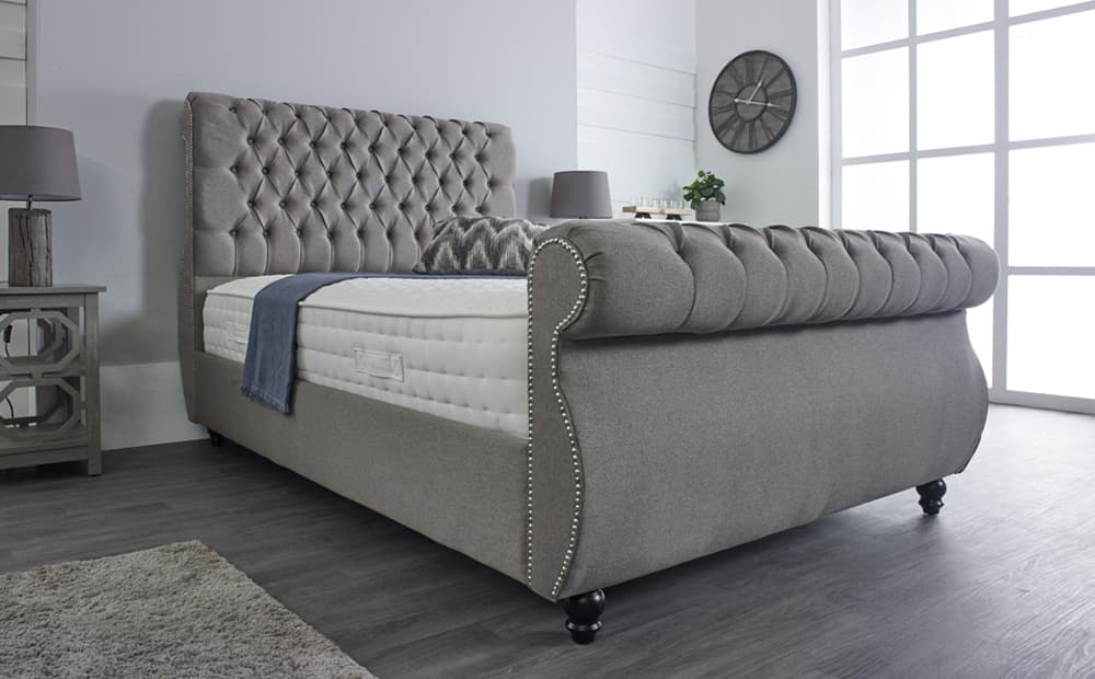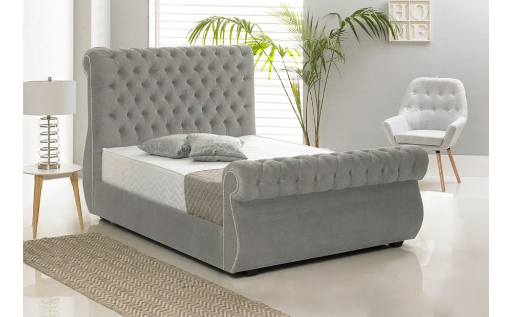 The Victoria Bed Frame is an extravagant bedstead. It features a chunky headboard & footboard curving like a swan. The bed is constructed with timber, hardwood and quality foam ensuring long-lasting durability. Side rails are padded and upholstered in the same fabric.